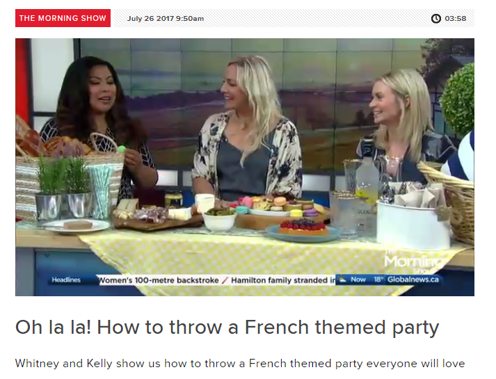 Still reminiscing our trip abroad, Whitney and I threw a summer bash at Soho House to celebrate Bastille Day. It was such a hit, that we wanted to share our tips and tricks on Global TV’s The Morning Show! Today Whitney and I gave some insight into how to throw an unforgettable French countryside-themed bash by serving savory foods, creating a thematic ambiance, sipping refreshing floral cocktails and nibbling on famous French sweets. Check out our segment here and let us know what else you would do to make your own French soirée a hit!