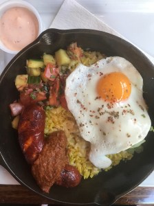 I started with a lavendar latte (recommended to me from both a friend and my sister-yum!) and my sister ordered a side order of the maple glazed bacon which happened to be the thickest-cut bacon I have ever seen. I had the Paella (1 fried egg, curried orzo, hot Spanish chorizo, charred tomato salsa, cucumber, picked cilantro), Ian had the Fricassée (braised short ribs, balsamic cipollini onions, potatoes, watercress, fried eggs, applewood smoked cheddar) and we all had some waffles (obviously). The waffles are only $3.15 each and are great for kids and adults alike; bet you can’t each just one!