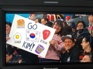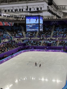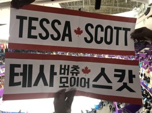 Grace, Jane, April and I had tickets to the Ice Dance short program. We were so anxious as we watched everyone skate, munching on fried dumplings and drinking mule (water) in our seats. Two men sitting behind us, a Korean man and a Japanese man, leaned forward and handed us Scott and Tessa banners they had been given. One of them was in English and the other was in Korean. It seemed that everyone was rooting for the legendary ice dancers.