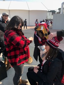 Before the game even started, a major highlight occurred for Grace, April, Jane and I: we met Ice Dance Royalty Scott Moir. He was standing in line to get beer, and was obviously on a two-Gold-Medal high. He was so sweet and funny, and he loved our goose hats! He took pictures with us and I was elated.