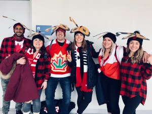 Ian T, Jane, April, Anup and I are on the train back into Seoul from PyeongChang after a long, exhilarating day. Our entire group made Canadian ‘flying geese’ hats to wear for the hockey game and they were a huge hit! Our friend Grace was the brains behind the operation and they looked amazing. We were spotted on CBC camera feeds, and were also interviewed by Global News! We headed into the arena and our excitement mounted as our new friends Paige (a fellow volunteer and friend of my sister Shane), Rachel (a fellow volunteer and friend of my friend Sonya’s) and Marianne (a friend of Ian M’s) joined us.