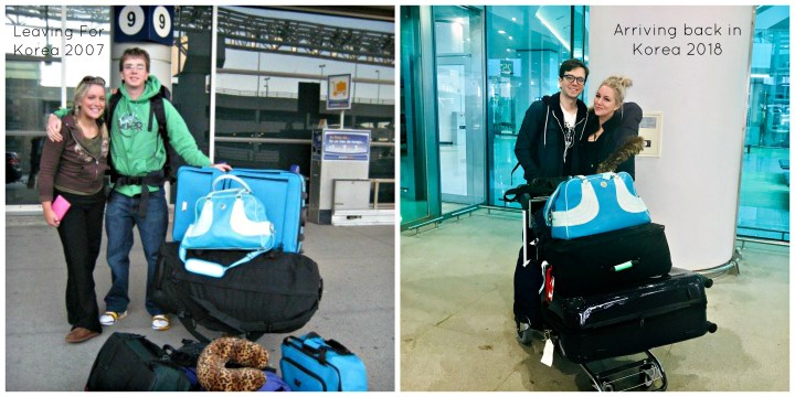 The left photo was taken by Ian’s mom the day we left for Seoul, on May 7, 2007. The photo on the right was taken by our friend Grace, the day we arrived in Seoul for the Olympics, February 2018. And yes, these pictures are proof that Lulu Lemon gym bags are durable. 😉
