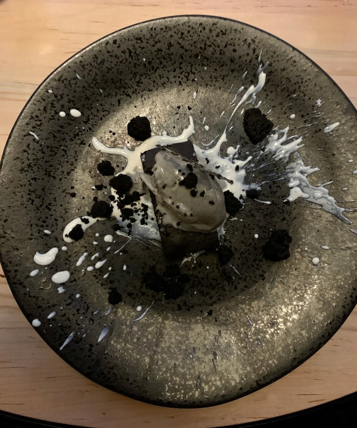 For our main course, I really wanted the Teppanykai Noodle dish (sticky udon noodles with ginger, fried halibut cheeks, Gulf shrimp with Togarashi oil, soft-boiled egg, creamy almond, king oyster mushroom and baby ginger). This dish, however, traditionally comes with an almond-based sauce and I’m allergic. However, the chef decided to take something else in season- kefir limes- and adjust the dish completely for me. And it was probably my favourite dish I ate on the trip though I still can’t decide! I had never had halibut cheeks before, and they were all-consuming. The seasoning, freshness and combination of everything in this dish tasted Devine.