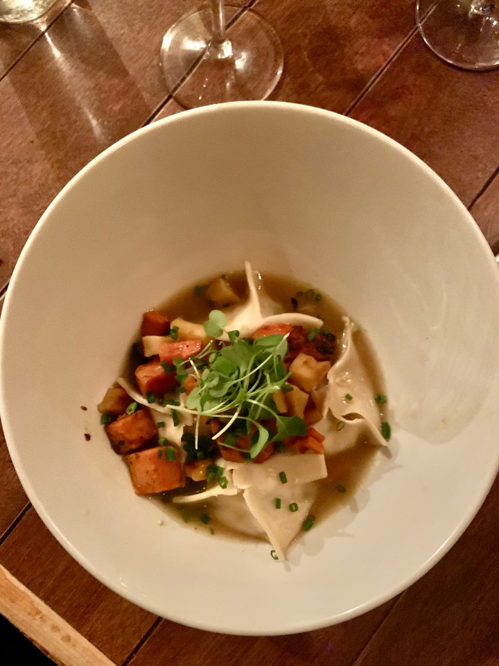 L’affaire has a very unassuming curb appeal with a painted ketchup bottle on its wooden front door. Upon entering, it it felt as though we were heading into a converted older home- which we probably were. The restaurant was about the size of the main floor of our home in Toronto and fit about seven tables, a kitchen, plus a few seats at the bar. The menu was written on a chalkboard, and once the 6:00 seating had ordered their drinks and picked out their bottles of wine from an antique wooden pantry, the server caught everyone’s attention and announced what each element son the chalkboard entailed, in both French and then English for the few of us who didn’t speak the native tongue. Ian and I shared white fish-stuffed dumplings, covered in broth and accompanied by roasted parsnips and sweet potatoes. Ian found the dumplings a bit stretchy and undercooked for his liking, and while I enjoyed the appetizer overall, I wasn’t super keen on the fish. But don’t let our experience with the appetizer deter you- it was still delectable and the rest of our meal tickled our taste buds beyond belief. My mouth is watering as I think back on our meal….
