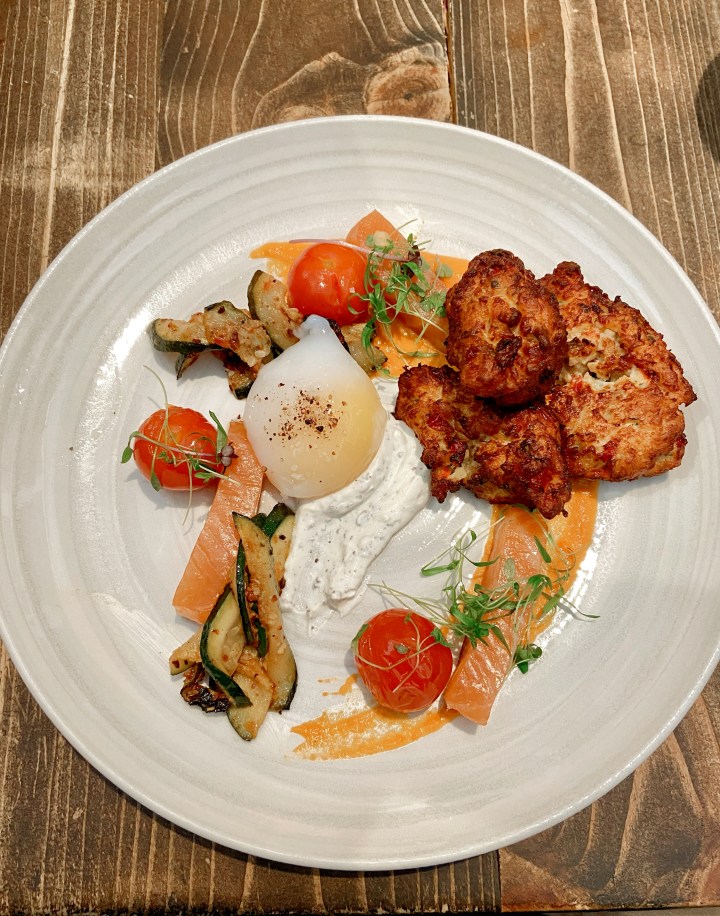 Ian ordered Les Natures Divines which is a plate of homemade maple wood smoked salmon, crispy salmon accras with dill & lemon sour cream with sea bacon, roasted Amandine-style zucchini with brown butter, fresh farm egg, romesco, and a tomato & herbs condiment. He added on their famous black pudding (apparently it used to be only on their dinner menu, but they had so many requests that they added it to the brunch menu too!) and he says that is one of his favourite things that he ate on the trip! And, I will admit, the sound of black pudding always deters me, but my gosh: this one was amazing. The black pudding was soft in the middle, crispy on top, and served with a beet spread. I think it is safe to say that we highly recommend Chez Rioux and Pettigrew– and next time we head back to Quebec City, I want to check out them out for dinner too!